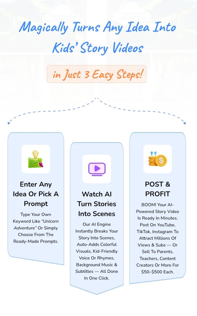 Step 3: Post & ProfitBOOM! Your AI-powered story video is ready in minutes.Post on YouTube, TikTok, Instagram to attract millions of viewsOr sell to parents, teachers, content creators for $50–$500 per video